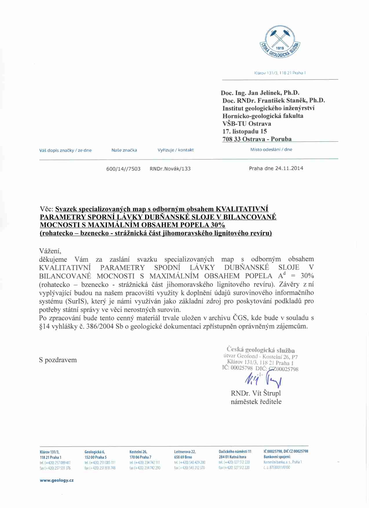 | Svazek specializovaných map s odborným obsahem KVALITATIVNÍ PARAMETRY SVRCHNÍ LÁVKY DUBŇANSKÉ SLOJE V BILANCOVANÉ MOCNOSTI S MAXIMÁLNÍM OBSAHEM POPELA 35% (rohatecko – bzenecko - strážnická část jihomoravského lignitového revíru) - text, osvědčení, potvrzení, mapa1, mapa2, mapa3 | doc. Ing. Jan Jelínek, Ph.D. doc. RNDr. František Staněk, Ph.D. Ing. Juraj Kisztner Mgr. Marcela Jarošová RNDr. Jana Staňková, Ph.D. |